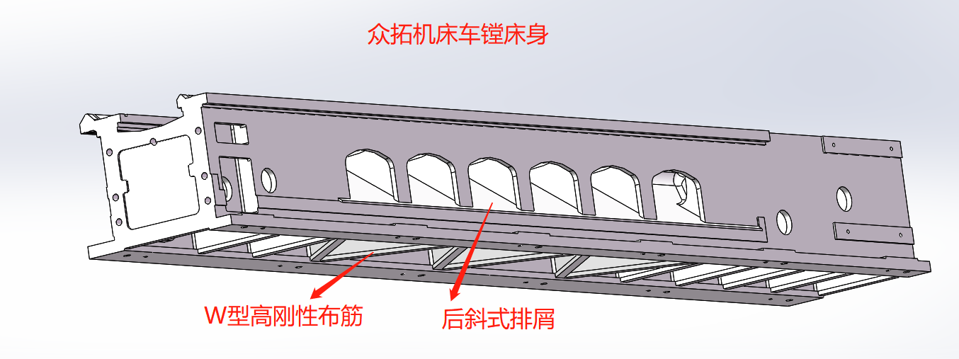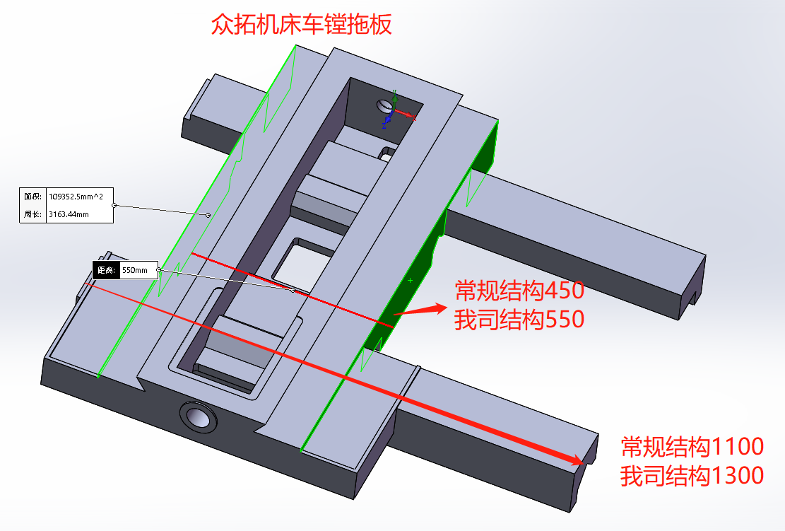 車鏜床結(jié)構(gòu)拖板相對(duì)于普通結(jié)構(gòu)拖板進(jìn)行了充分的加強(qiáng):拖板跨度加大、厚度加厚、燕尾跨度及高度增加、拖板后側(cè)增加安裝鏜桿支架底座的安裝面并加大了厚度;