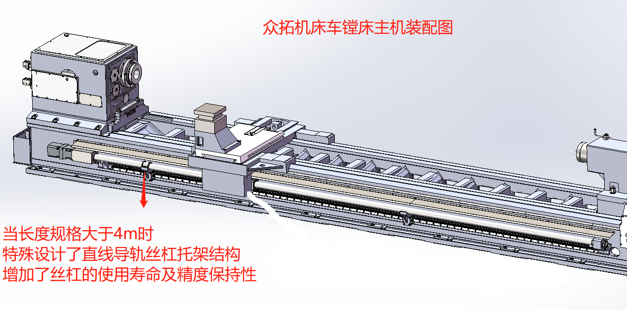 為設(shè)備的內(nèi)孔鏜削加工提供足夠的剛性支撐。拖板絲杠中置,絲桿軸承支座裝配時(shí)充分找正,并采用預(yù)拉伸結(jié)構(gòu),提高了剛性及穩(wěn)定性。